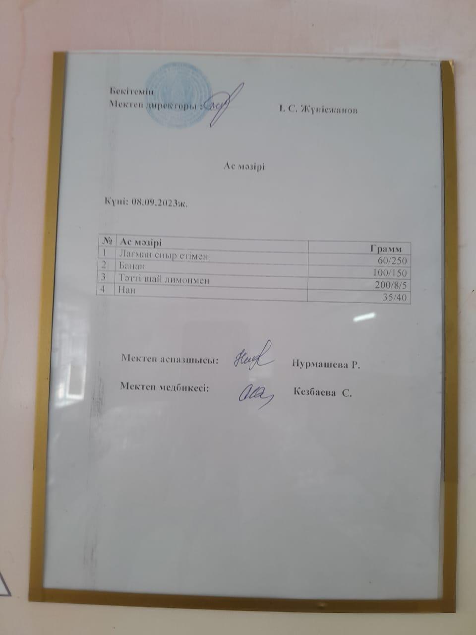 № 4 Тілеміс батыр жалпы орта білім беретін мектебінде 1-4 сыныпта барлығы 242 оқушы бар. Денсаулығына байланысты бір оқушы үйден оқытылады. 241 оқушы тегін ыстық тамақпен қамтылып отыр. І ауысымда 86 оқушы, ІІ ауысымда 177 оқушы қамтылған. Жекеленген санаттағы 22 оқушы да тегін тамақпен қамтылып, тамақтану кестесіне сәйкес бір мезгіл тегін тамақтанады. Ас мәзірі жасалып бекітілген. Аспазшылар ас мәзіріне сәйкес тағамдарды әзірлейді. Бүгінгі ас мәзірінде: лагман сиыр етімен. банан, тәтті шай лимонмен нан.