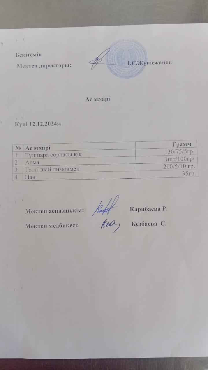 12 декабрь 2024 0 1 2 3 4 5 Ыстық тамақ Бастауыш 1-4 сынып оқушылары мен жекелеген санаттағы оқушылар тегін және жеңілдетілген тамақпен қамтылып отыр. Бейсенбі 12 желтоқсан күнгі ас мәзірі : тұшпара сорпасы қ/қ, алма, тәтті шай лимонмен, нан.