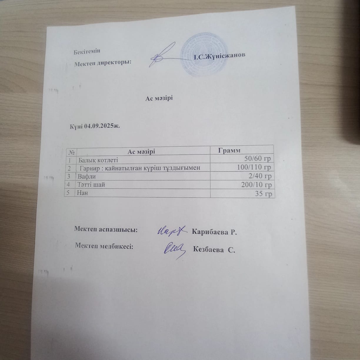 04 сентябрь 2025 0 1 2 3 4 5 Ыстық тамақ Бастауыш 1-4 сынып оқушылары мен жекелеген санаттағы оқушылар тегін және жеңілдетілген тамақпен қамтылып отыр. Бейсенбі 04 қыркүйек күнгі ас мәзірі : балық котлеті, гарнир қайнатылған күріш тұздығымен,вафли, тәтті шәй, нан.