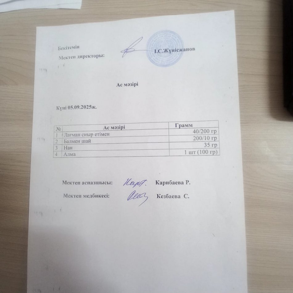05 сентябрь 2025 0 1 2 3 4 5 Ыстық тамақ Бастауыш 1-4 сынып оқушылары мен жекелеген санаттағы оқушылар тегін және жеңілдетілген тамақпен қамтылып отыр. Жұма 05 қыркүйек күнгі ас мәзірі : лағман сиыр етімен,балмен шәй, нан, алма.