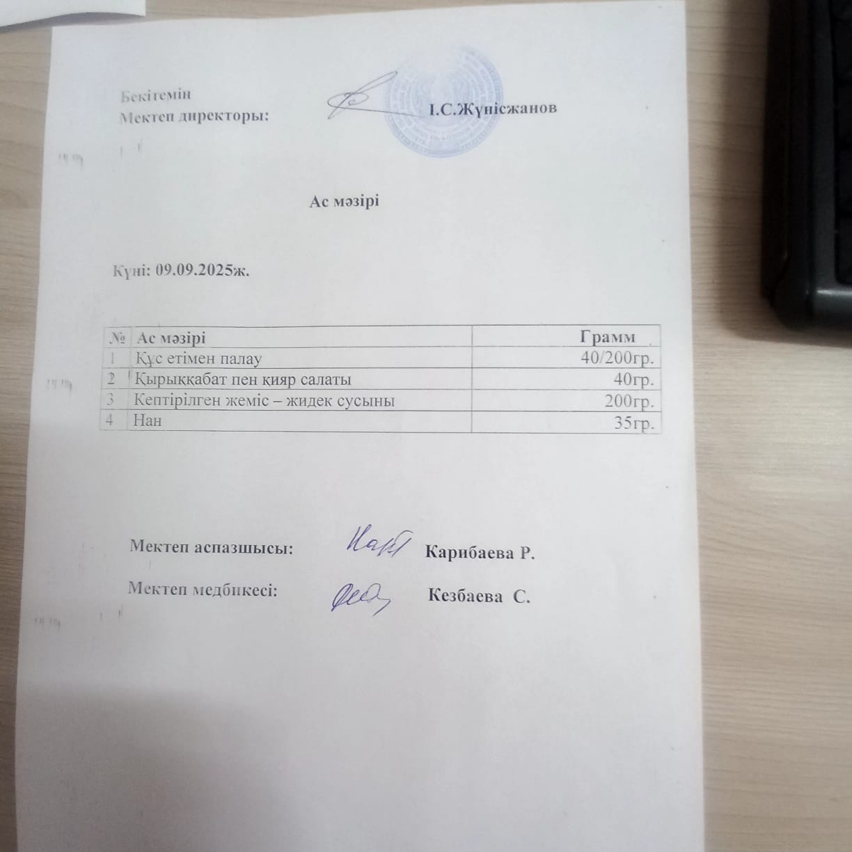 09 сентябрь 2025 0 1 2 3 4 5 Ыстық тамақ Бастауыш 1-4 сынып оқушылары мен жекелеген санаттағы оқушылар тегін және жеңілдетілген тамақпен қамтылып отыр. Сейсенбі 09 қыркүйек күнгі ас мәзірі : құс етімен палау,қырық қабатпен қияр салаты, кептірілген жеміс-жидек сусыны, нан.