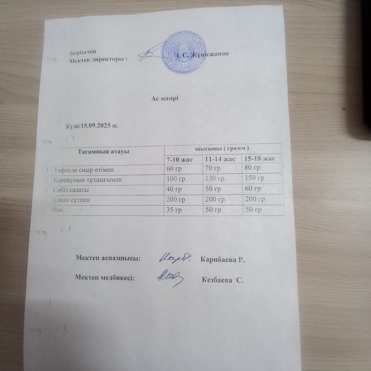 15 сентябрь 2025 0 1 2 3 4 5 Ыстық тамақ Бастауыш 1-4 сынып оқушылары мен жекелеген санаттағы оқушылар тегін және жеңілдетілген тамақпен қамтылып отыр.Дүйсенбі 15 қыркүйек күнгі ас мәзірі : сиыр етінен тефтели, қарақұмық тұздығымен, сәбіз салаты, какао сүтпен, нан.