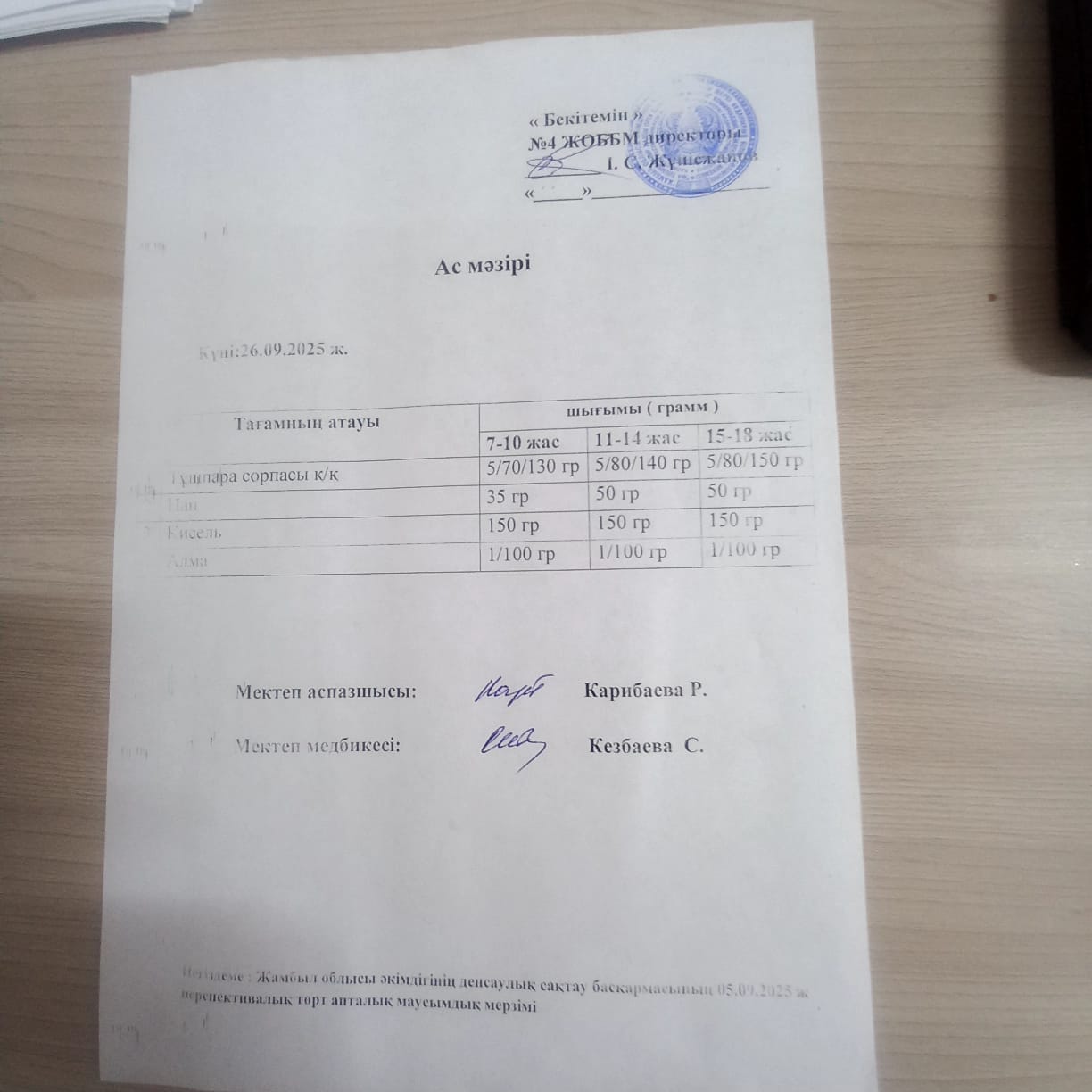 26 сентябрь 2025 0 1 2 3 4 5 Ыстық тамақ Бастауыш 1-4 сынып оқушылары мен жекелеген санаттағы оқушылар тегін және жеңілдетілген тамақпен қамтылып отыр. Жұма 26 қыркүйек күнгі ас мәзірі : тұшпара сорпасы қ/қ, кисель, алма, нан.
