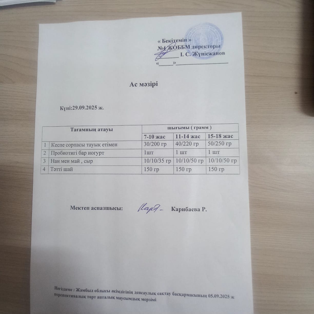 29 сентябрь 2025 0 1 2 3 4 5 Ыстық тамақ Бастауыш 1-4 сынып оқушылары мен жекелеген санаттағы оқушылар тегін және жеңілдетілген тамақпен қамтылып отыр. Дүйсенбі 29 қыркүйек күнгі ас мәзірі : кеспе сорпасы тауық етімен, пробиотигі бар иогурт, сыр, нан мен май, тәтті шәй.