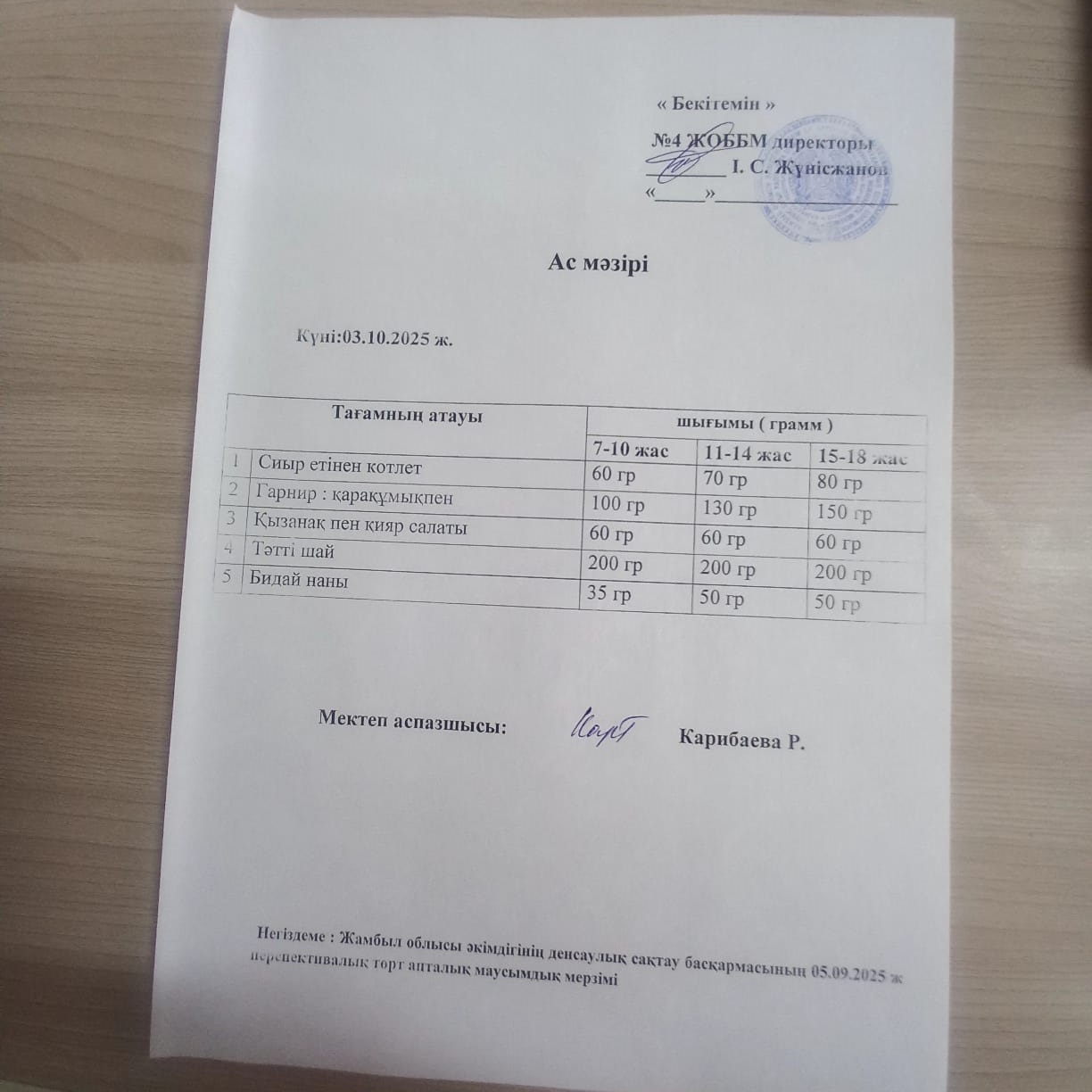 03 октябрь 2025 0 1 2 3 4 5 Ыстық тамақ Бастауыш 1-4 сынып оқушылары мен жекелеген санаттағы оқушылар тегін және жеңілдетілген тамақпен қамтылып отыр. Жұма 3 қазан күнгі ас мәзірі : сиыр етінен котлет, гарнир: қарақұмықпен, қызанақ пен қияр салаты, бидай наны, тәтті шәй.