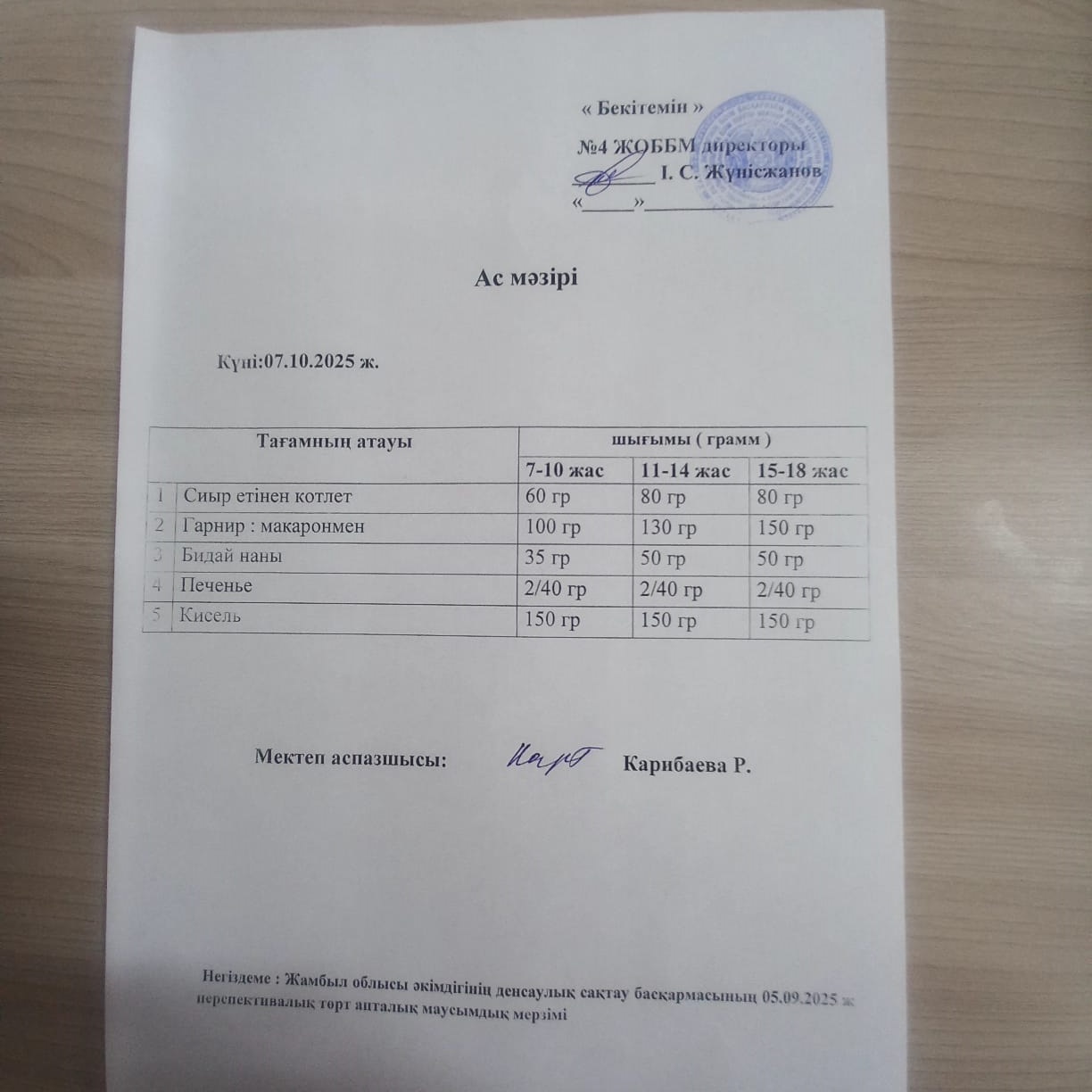 07 октябрь 2025 0 1 2 3 4 5 Ыстық тамақ Бастауыш 1-4 сынып оқушылары мен жекелеген санаттағы оқушылар тегін және жеңілдетілген тамақпен қамтылып отыр. Сейсенбі 7 қазан күнгі ас мәзірі : сиыр етінен котлет, гарнир: макаронмен, бидай наны, печенье, кисель.