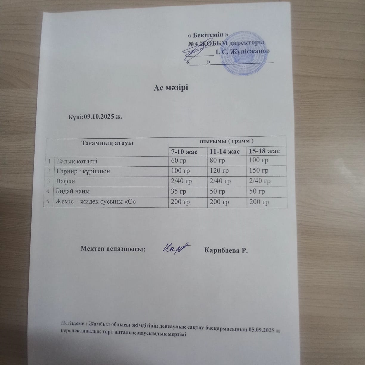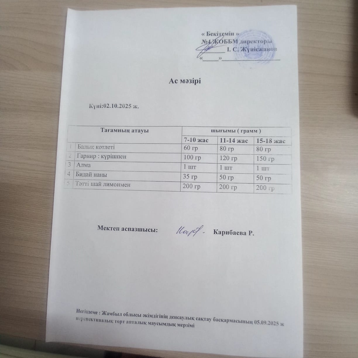 Бастауыш 1-4 сынып оқушылары мен жекелеген санаттағы оқушылар тегін және жеңілдетілген тамақпен қамтылып отыр. Бейсенбі 9 қазан күнгі ас мәзірі : балық котлеті, гарнир: күрішпен, вафли, бидай наны, жеміс-жидек сусыны.