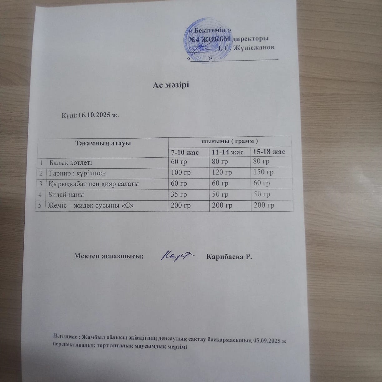 16 октябрь 2025 0 1 2 3 4 5 Ыстық тамақ Бастауыш 1-4 сынып оқушылары мен жекелеген санаттағы оқушылар тегін және жеңілдетілген тамақпен қамтылып отыр. Бейсенбі 16 қазан күнгі ас мәзірі : балық котлеті, гарнир: күрішпен, қырыққабатпен қияр салаты, бидай наны, жеміс-жидек сусыны.