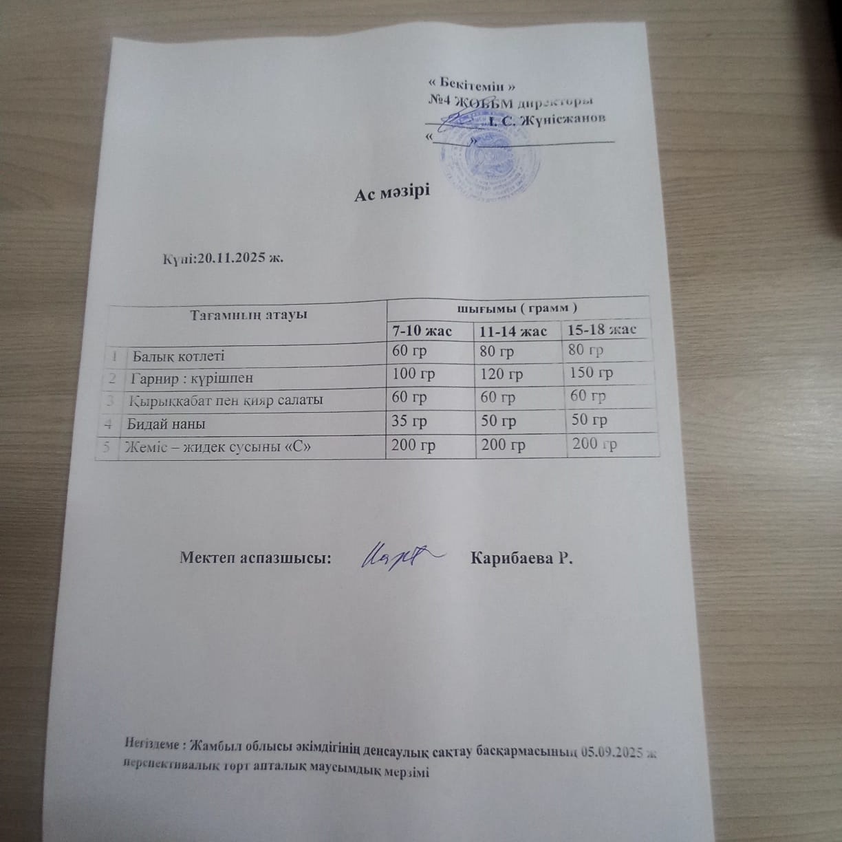 20 ноябрь 2025 0 1 2 3 4 5 Ыстық тамақ Бастауыш 1-4 сынып оқушылары мен жекелеген санаттағы оқушылар тегін және жеңілдетілген тамақпен қамтылып отыр. Бейсенбі 20 қараша күнгі ас мәзірі : балық котлеті, гарнир: күрішпен, қырыққабат пен қияр салаты, бидай наны, жеміс-жидек сусыны.