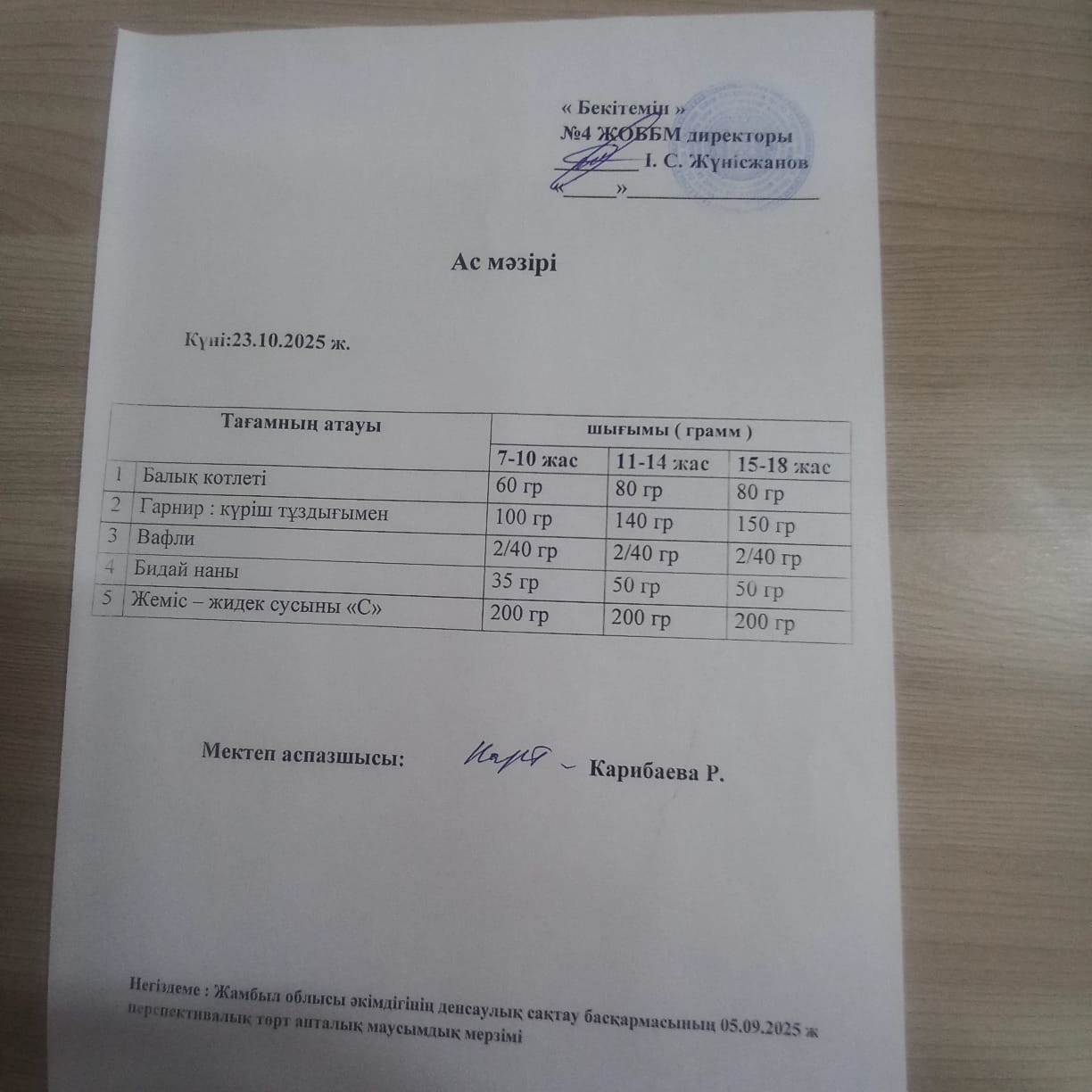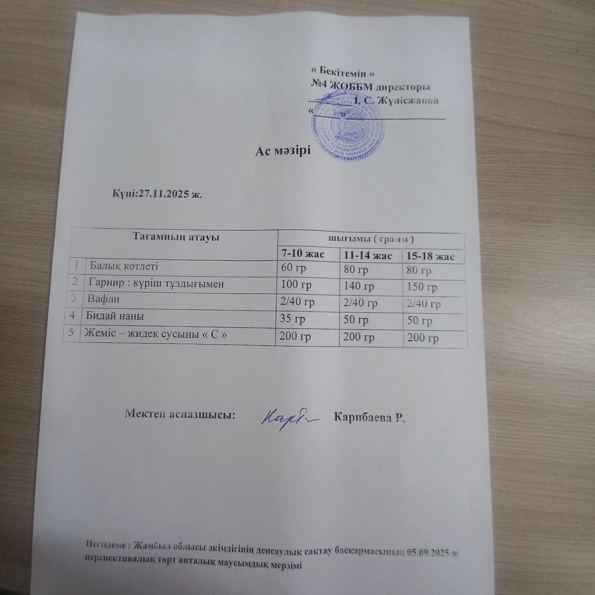 27 ноябрь 2025 0 1 2 3 4 5 Ыстық тамақ Бастауыш 1-4 сынып оқушылары мен жекелеген санаттағы оқушылар тегін және жеңілдетілген тамақпен қамтылып отыр. Бейсенбі 27 қараша күнгі ас мәзірі : балық котлеті, гарнир: күріш тұздығымен, вафли, бидай наны, жеміс-жидек сусыны.