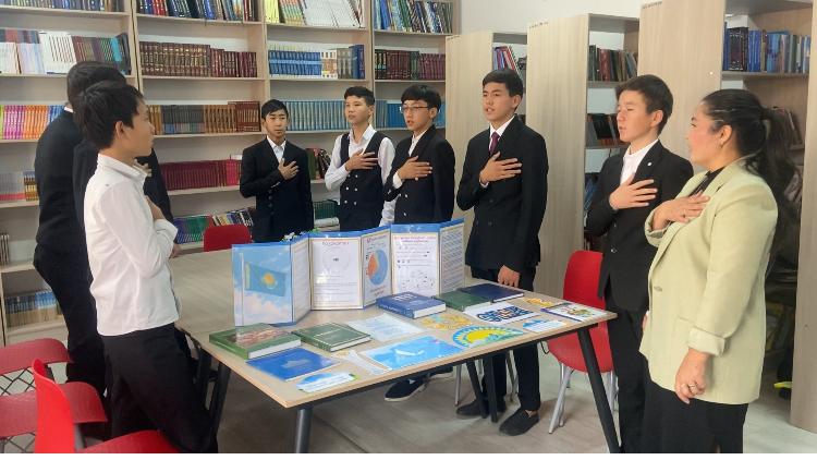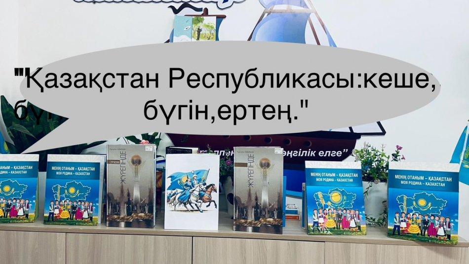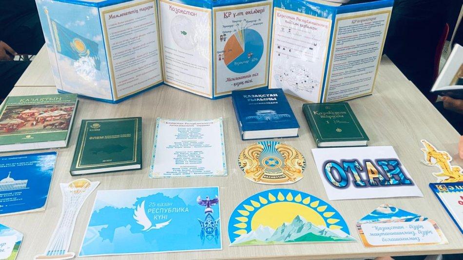 24.10. 2025ж. күні 9 сынып оқушыларымен кітапхана меңгерушісі Тулекова Айжан Республика күні мерекесіне орай "Қазақстан Республикасы: кеше, бүгін, ертең" тақырыбында тақырыптық көрме өткізді.