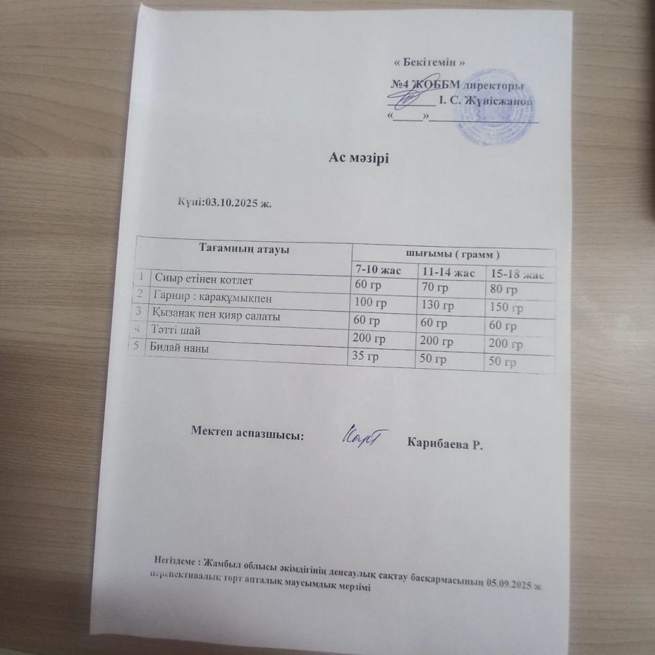 03 октябрь 2025 0 1 2 3 4 5 Ыстық тамақ Бастауыш 1-4 сынып оқушылары мен жекелеген санаттағы оқушылар тегін және жеңілдетілген тамақпен қамтылып отыр. Жұма 3 қазан күнгі ас мәзірі : сиыр етінен котлет, гарнир: қарақұмықпен, қызанақ пен қияр салаты, бидай наны, тәтті шәй.
