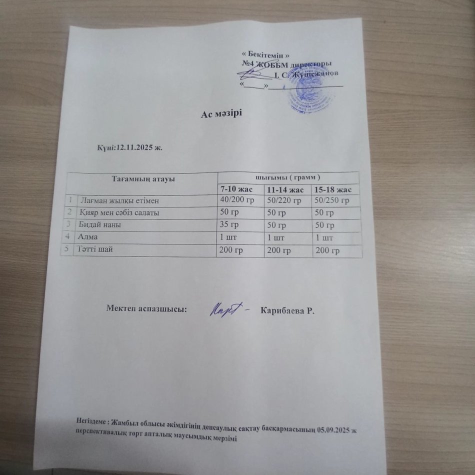 12 ноябрь 2025 0 1 2 3 4 5 Ыстық тамақ Бастауыш 1-4 сынып оқушылары мен жекелеген санаттағы оқушылар тегін және жеңілдетілген тамақпен қамтылып отыр. Сәрсенбі 12 қараша күнгі ас мәзірі : лагман жылқы етімен, қияр мен сәбіз салаты, бидай наны, алма, тәтті шәй.