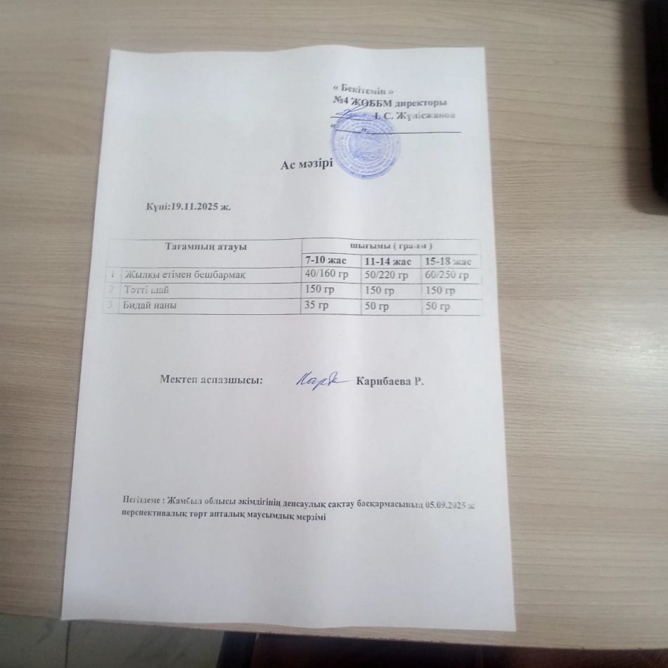 19 ноябрь 2025 0 1 2 3 4 5 Ыстық тамақ Бастауыш 1-4 сынып оқушылары мен жекелеген санаттағы оқушылар тегін және жеңілдетілген тамақпен қамтылып отыр. Сәрсенбі 19 қараша күнгі ас мәзірі : жылқы етімен бешбармақ,тәтті шәй, бидай наны.