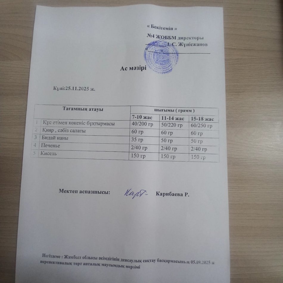 25 ноябрь 2025 0 1 2 3 4 5 Ыстық тамақ Бастауыш 1-4 сынып оқушылары мен жекелеген санаттағы оқушылар тегін және жеңілдетілген тамақпен қамтылып отыр. Сейсенбі 25 қараша күнгі ас мәзірі : құс етімен көкөніс бұқтырмасы, қиярмен сәбіз салаты, кисель, печенье, бидай наны.